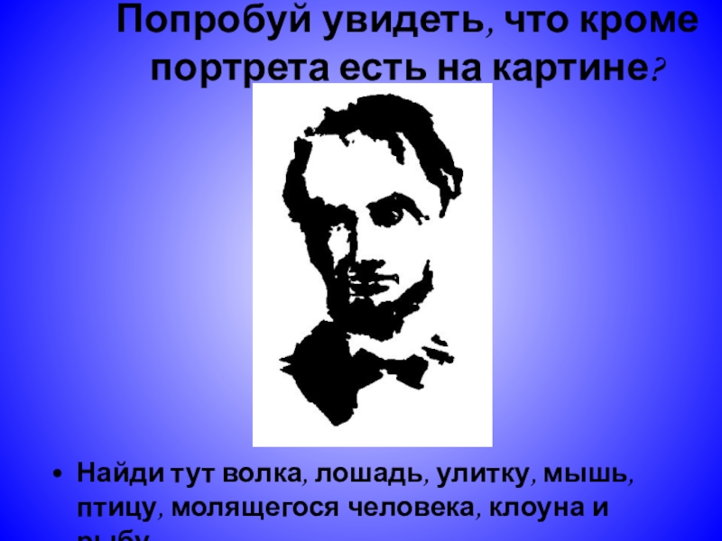 Попробуй увидеть, что кроме портрета есть на картине?   Найди тут волка, лошадь, улитку, мышь, птицу,