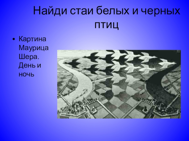 Найди стаи белых и черных птиц Картина Маурица Шера. День и ночь