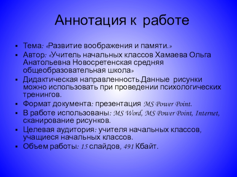 Аннотация к работеТема: «Развитие воображения и памяти.»Автор: «Учитель начальных классов Хамаева Ольга Анатольевна Новосретенская средняя общеобразовательная школа»Дидактическая направленность.Данные рисунки можно использовать при проведении психологических тренингов.Формат документа: презентация MS Power Point.В работе использованы: MS Word, MS Power