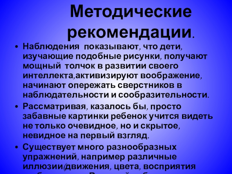 Методические рекомендации.Наблюдения показывают, что дети, изучающие подобные рисунки, получают мощный толчок в развитии своего интеллекта,активизируют воображение, начинают