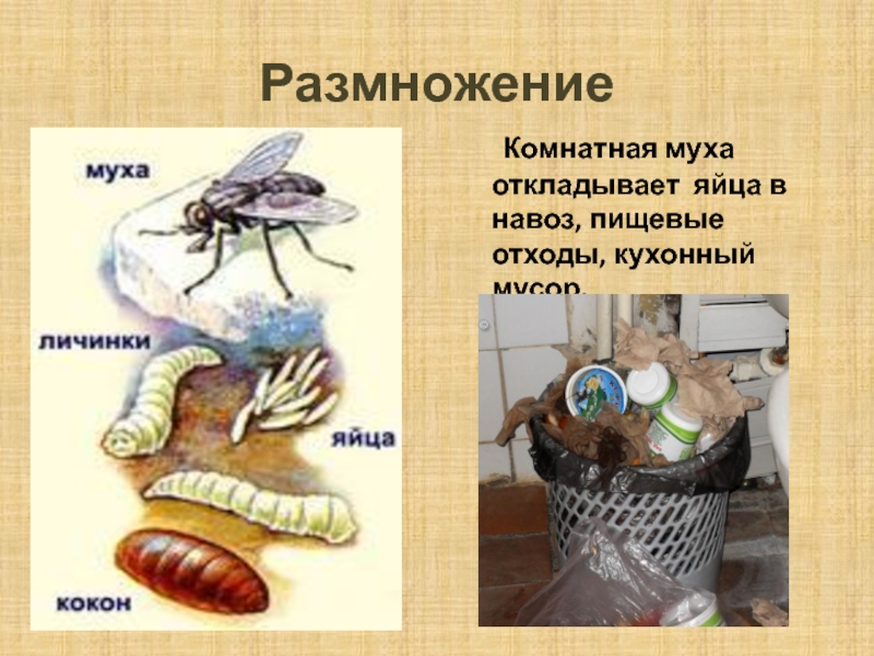 Комнатная муха откладывает яйца в навоз, пищевые отходы, кухонный мусор.