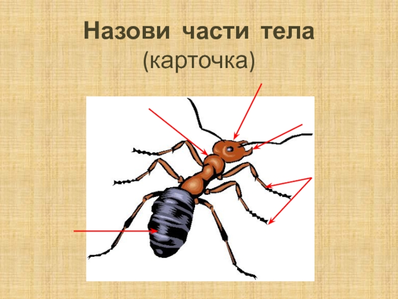 хвост, тело, голова, клюв, рога, грудь, копыта, брюшко, 2 лапы, 6 лапок