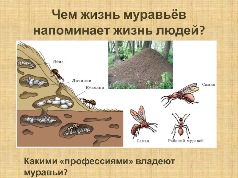Слайд 8Чем жизнь муравьёв напоминает жизнь людей?