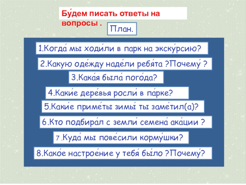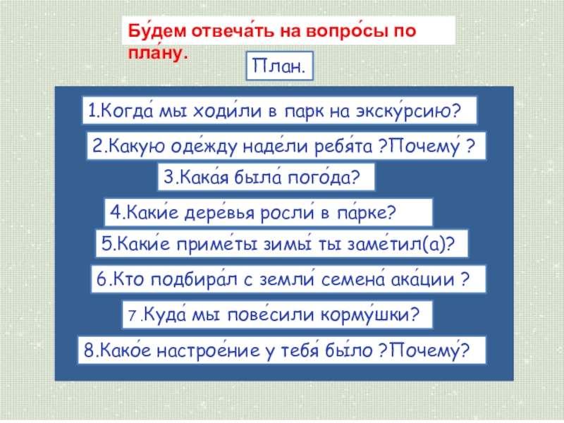 Бу́дем отвеча́ть на вопро́сы по пла́ну.