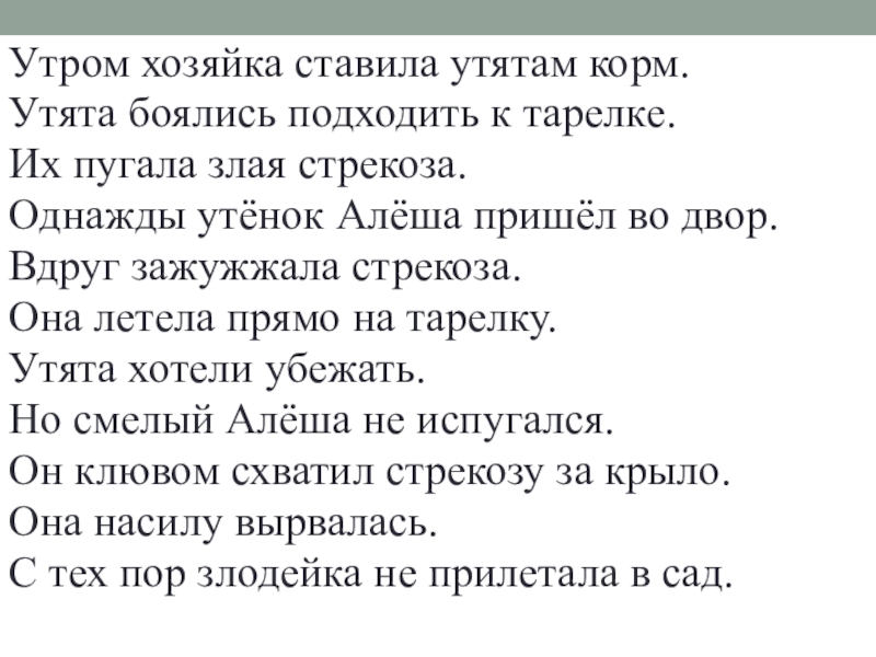 Утром хозяйка ставила утятам корм. Утята боялись подходить к тарелке. Их пугала злая стрекоза. Однажды утёнок Алёша пришёл