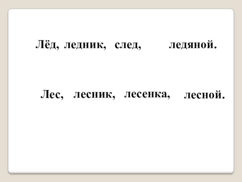 лесной.Лёд,ледник, след, ледяной.Лес,лесенка,лесник,