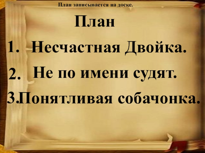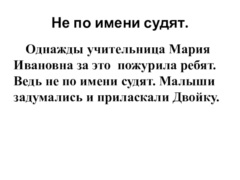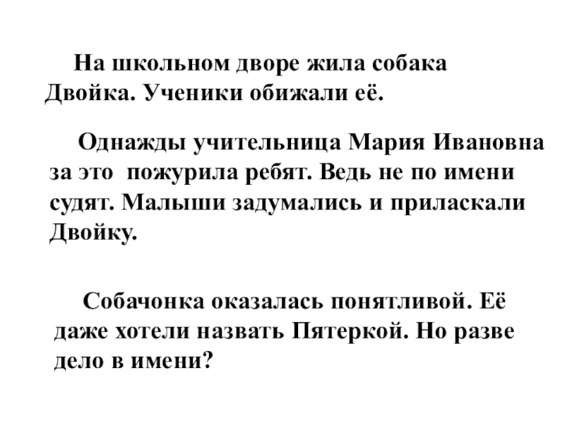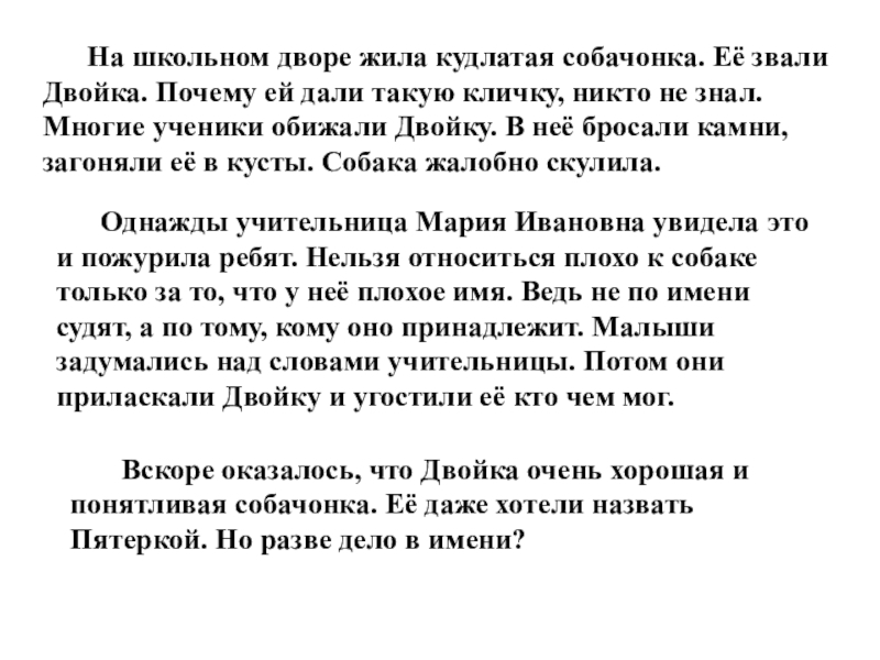 Однажды учительница Мария Ивановна увидела это и пожурила ребят. Нельзя относиться плохо к собаке только за то, что у неё плохое имя. Ведь не по имени судят, а по тому, кому оно принадлежит. Малыши задумались над словами учительницы. Потом они приласкали Двойку и угостили её кто чем мог.