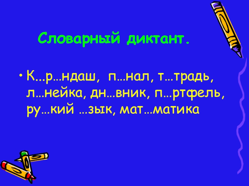 К...р…ндаш, п…нал, т…традь, л…нейка, дн…вник, п…ртфель, ру…кий …зык, мат…матика