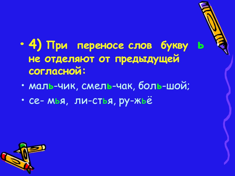 4)При переносе слов букву ь не отделяют от предыдущей согласной: маль-чик