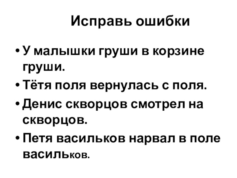 Исправь ошибкиУ малышки груши в корзине груши.Тётя поля вернулась с поля.Денис скворцов смотрел на скворцов.Петя васильков нарвал