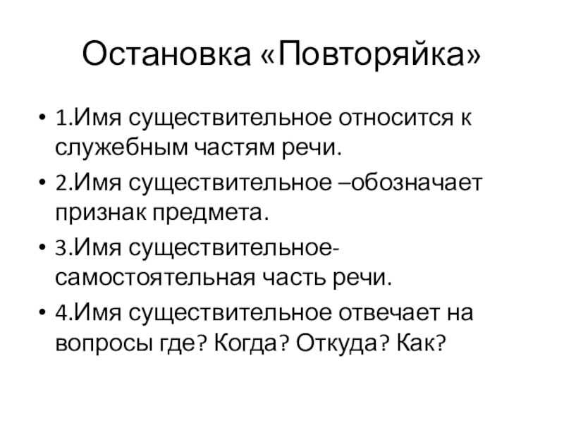 Остановка «Повторяйка»1.Имя существительное относится к служебным частям речи. 2.Имя существительное –обозначает признак предмета.3.Имя существительное- самостоятельная часть речи.4.Имя