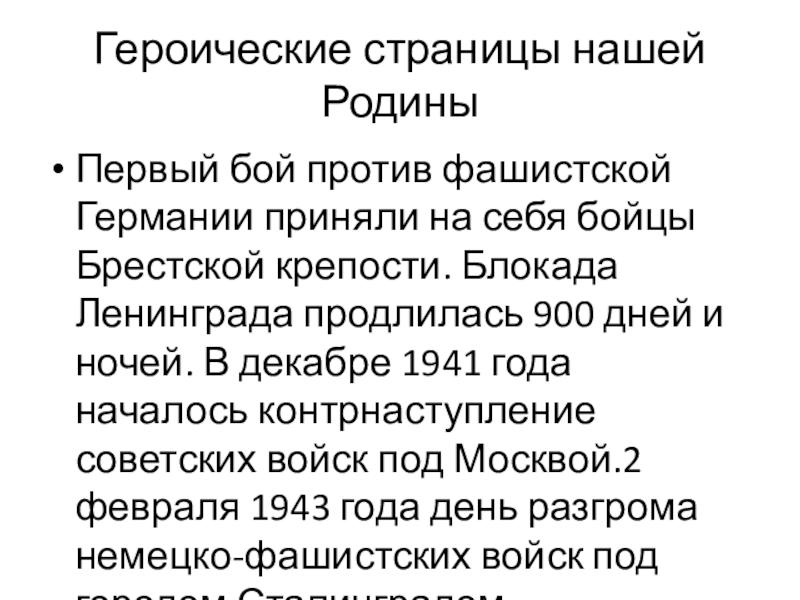 бойцы Брестской крепости. Блокада Ленинграда продлилась 900 дней и ночей. В декабре 1941 года началось контрнаступление советских войск под Москвой.2 февраля 1943 года день разгрома немецко-фашистских войск под городом Сталинградом.