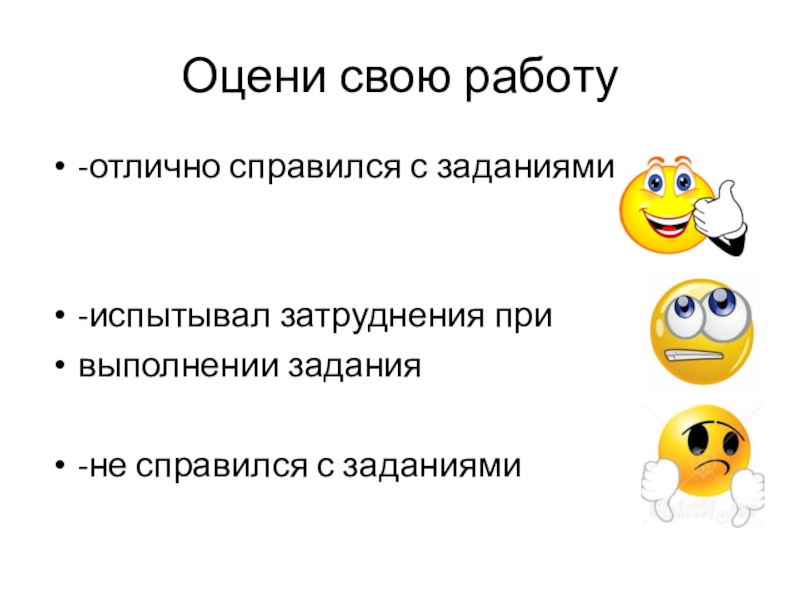 Оцени свою работу-отлично справился с заданиями-испытывал затруднения привыполнении задания-не справился с заданиями
