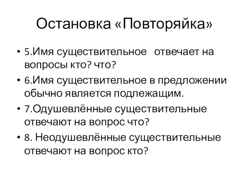Остановка «Повторяйка»5.Имя существительное  отвечает на вопросы кто? что?6.Имя существительное в предложении обычно является подлежащим.7.Одушевлённые существительные отвечают