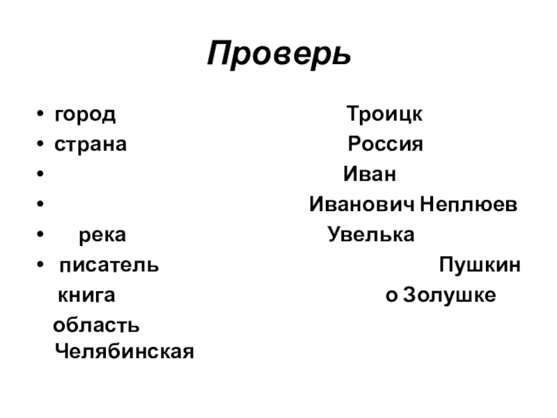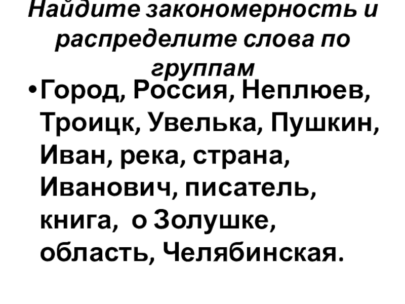 Найдите закономерность и распределите слова по группамГород, Россия, Неплюев, Троицк, Увелька, Пушкин, Иван, река, страна, Иванович, писатель,