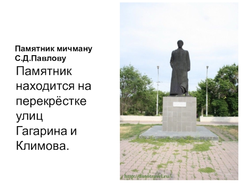 Памятник мичману С.Д.ПавловуПамятник находится на перекрёстке улиц Гагарина и Климова.