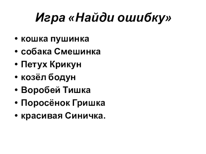 Игра «Найди ошибку»кошка пушинкасобака СмешинкаПетух Крикункозёл бодунВоробей ТишкаПоросёнок Гришкакрасивая Синичка.