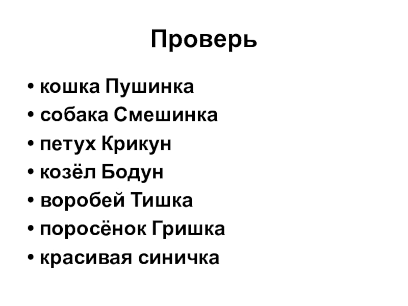 Проверькошка Пушинкасобака Смешинкапетух Крикункозёл Бодунворобей Тишкапоросёнок Гришкакрасивая синичка