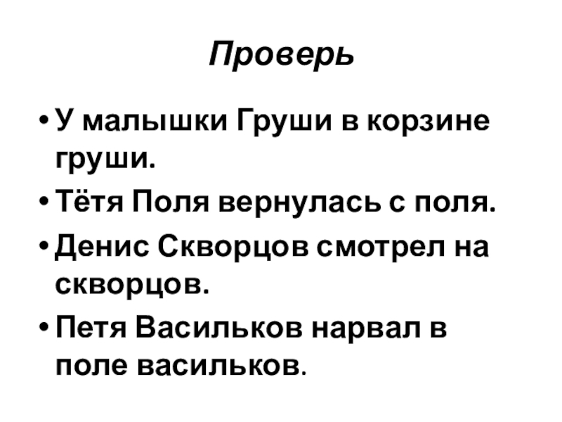 ПроверьУ малышки Груши в корзине груши.Тётя Поля вернулась с поля.Денис Скворцов смотрел на скворцов.Петя Васильков нарвал в