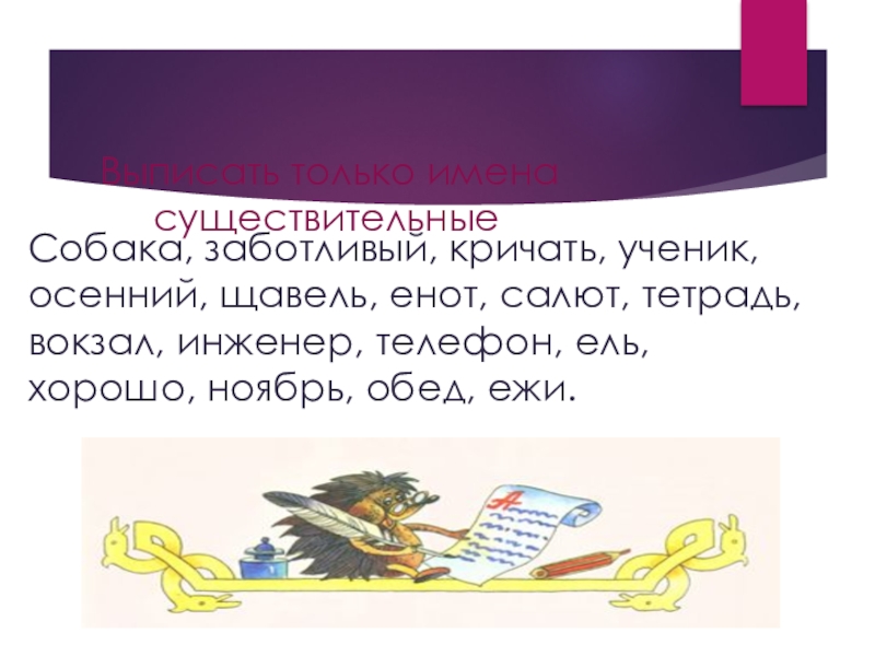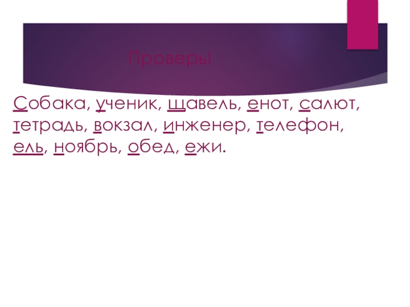 Собака, заботливый, кричать, ученик, осенний, щавель, енот, салют, тетрадь, вокзал, инженер, телефон, ель, хорошо, ноябрь, обед, ежи.