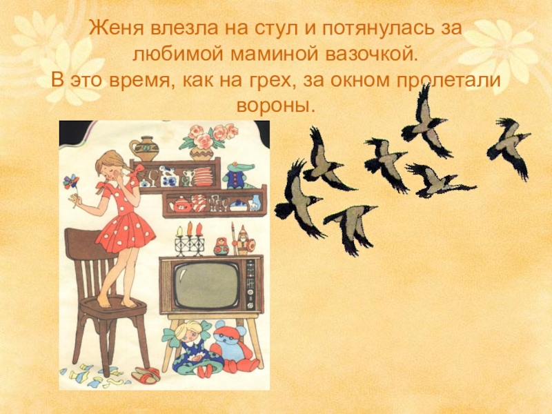 Слайд 4Женя влезла на стул и потянулась за любимой маминой вазочкой. В