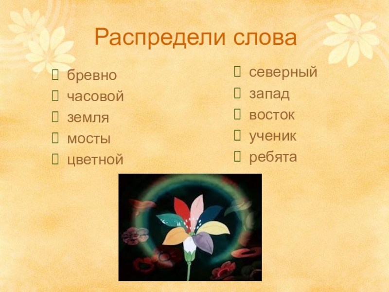 Распредели слова бревночасовойземлямостыцветнойсеверныйзападвостокученикребята