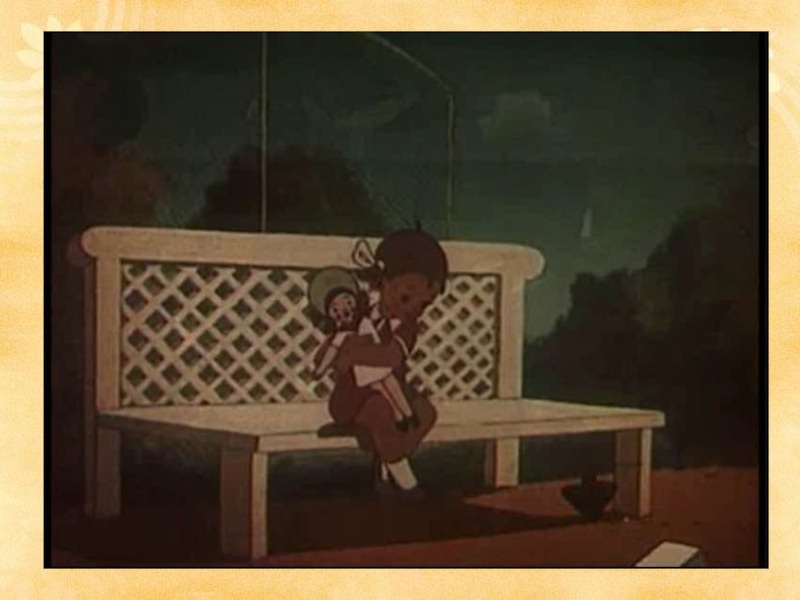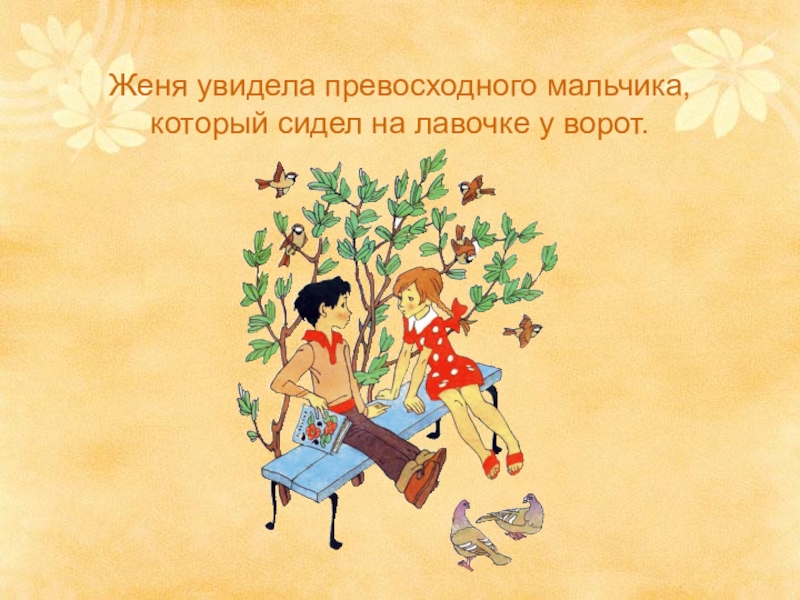 Слайд 7Женя увидела превосходного мальчика, который сидел на лавочке у ворот.