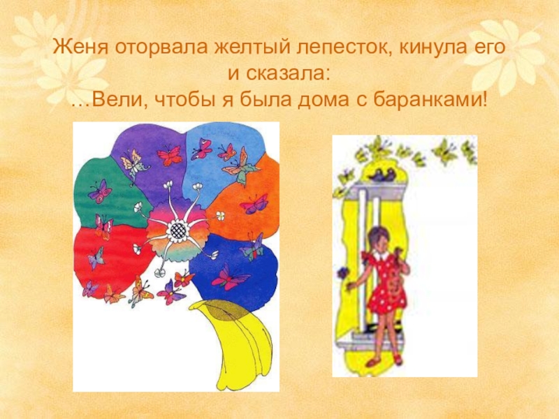 Слайд 3Женя оторвала желтый лепесток, кинула его и сказала: …Вели, чтобы я была