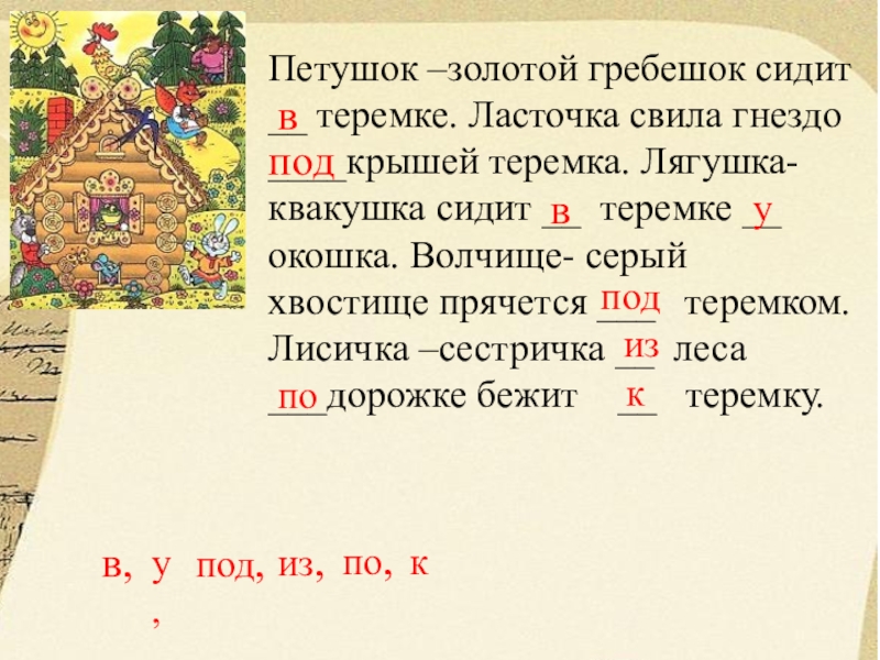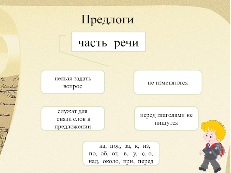 Нана, под, за, к, из, по, об, от, в, у, с, о, над, около, при, перед