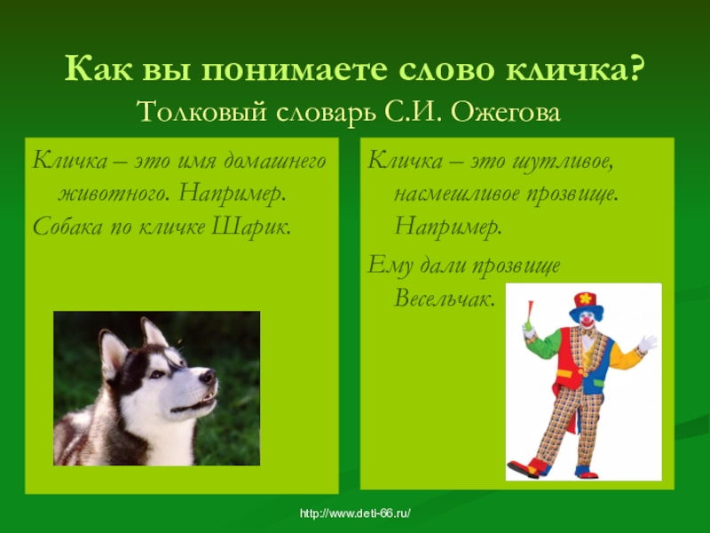 Кличка – это шутливое, насмешливое прозвище. Например.