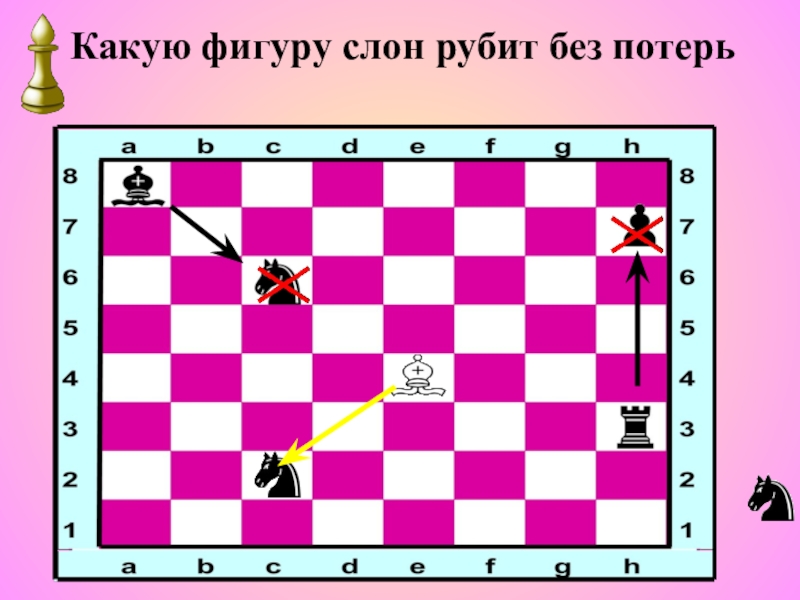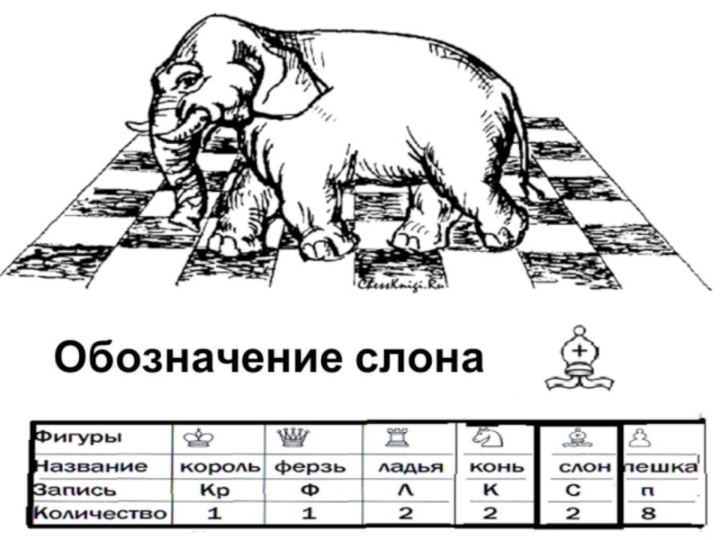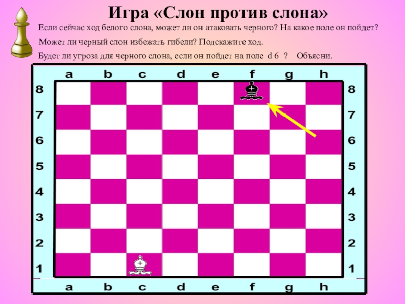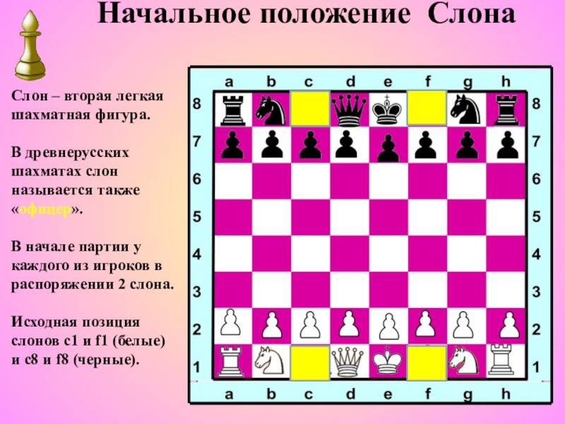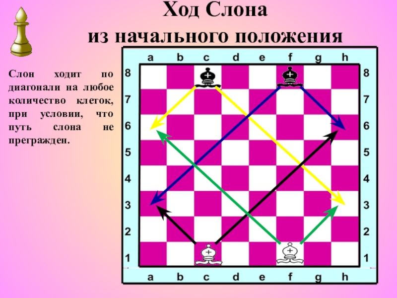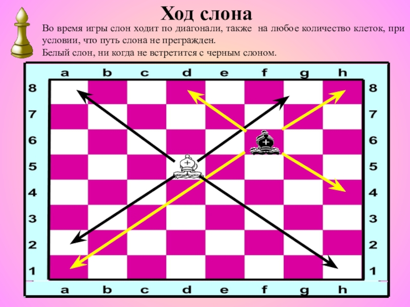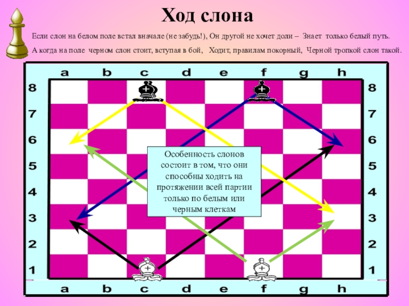 Особенность слонов состоит в том, что они способны ходить на протяжении всей партии только по белым или черным клеткам