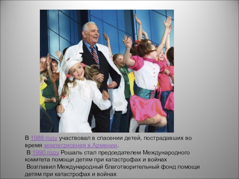 В 1988 году участвовал в спасении детей, пострадавших во время землетрясения в Армении. В 1990 году Рошаль стал председателем Международного комитета помощи детям