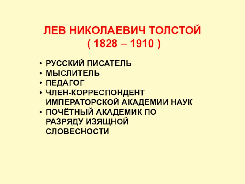 РУССКИЙ ПИСАТЕЛЬМЫСЛИТЕЛЬПЕДАГОГЧЛЕН-КОРРЕСПОНДЕНТ ИМПЕРАТОРСКОЙ АКАДЕМИИ НАУКПОЧЁТНЫЙ АКАДЕМИК ПО РАЗРЯДУ ИЗЯЩНОЙ СЛОВЕСНОСТИ ЛЕВ НИКОЛАЕВИЧ ТОЛСТОЙ ( 1828 – 1910 )