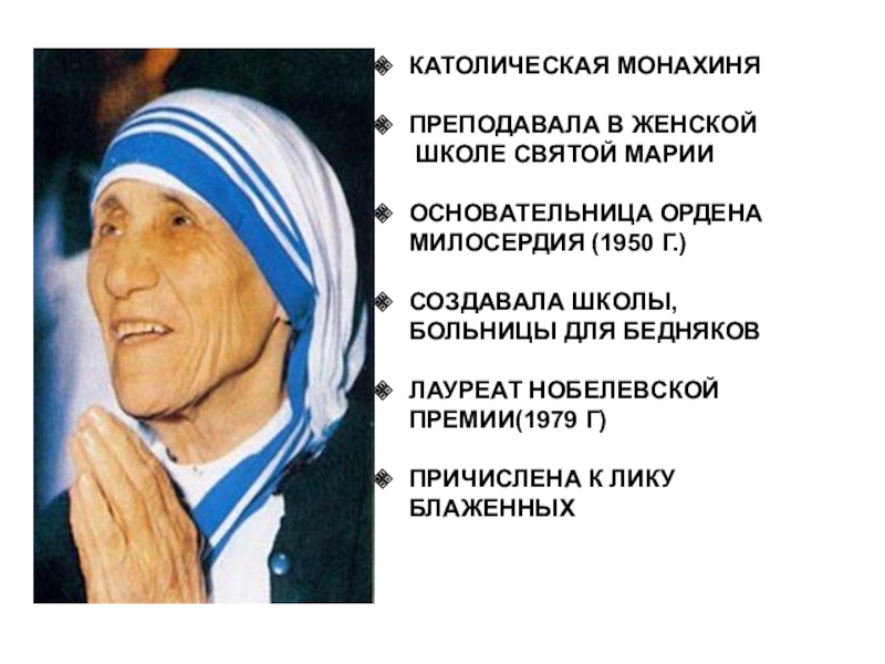 КАТОЛИЧЕСКАЯ МОНАХИНЯПРЕПОДАВАЛА В ЖЕНСКОЙ   ШКОЛЕ СВЯТОЙ МАРИИОСНОВАТЕЛЬНИЦА ОРДЕНА МИЛОСЕРДИЯ (1950 Г.) СОЗДАВАЛА ШКОЛЫ, БОЛЬНИЦЫ ДЛЯ