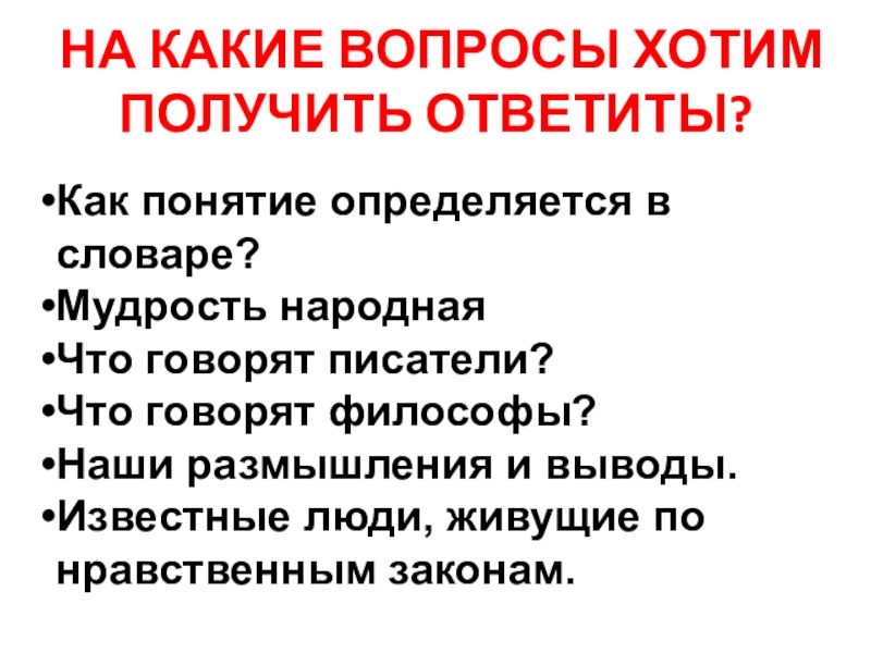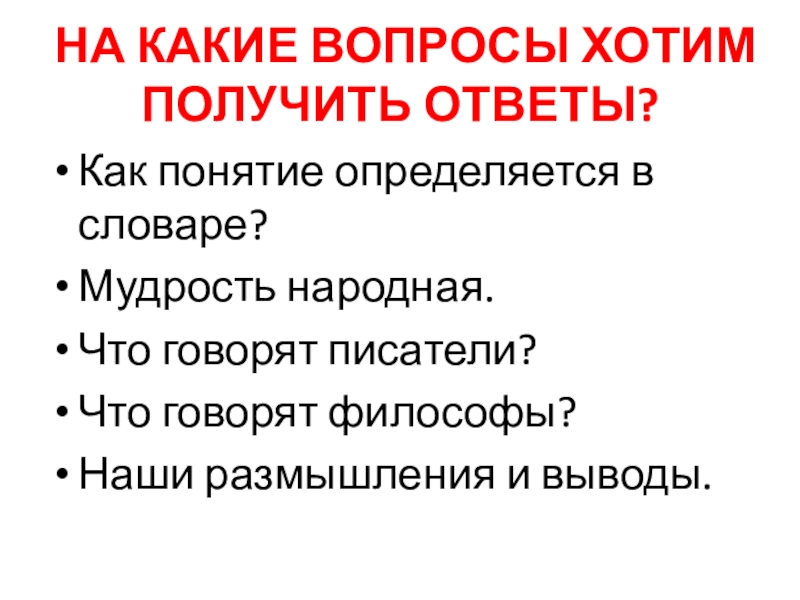 НА КАКИЕ ВОПРОСЫ ХОТИМ ПОЛУЧИТЬ ОТВЕТЫ?Как понятие определяется в словаре?Мудрость народная.Что говорят писатели?Что говорят философы?Наши размышления и