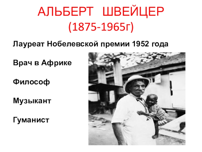 АЛЬБЕРТ  ШВЕЙЦЕР (1875-1965г)Лауреат Нобелевской премии 1952 годаВрач в АфрикеФилософМузыкантГуманист