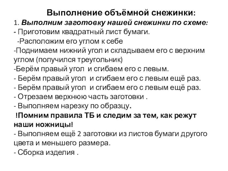 Выполнение объёмной снежинки: 1. Выполним заготовку нашей снежинки по схеме: - Приготовим квадратный лист бумаги. -Расположим его углом к себе -Поднимаем нижний угол и складываем его с верхним углом (получился треугольник) -Берём правый угол  и сгибаем его с левым. - Берём правый угол  и сгибаем его с левым ещё раз. - Берём правый угол  и сгибаем его с левым ещё раз. - Отрезаем верхнюю часть заготовки . - Выполняем нарезку по образцу. !Помним правила ТБ и следим за тем, как режут наши ножницы! - Выполняем ещё 2 заготовки из листов бумаги другого цвета и меньшего размера. - Сборка изделия .