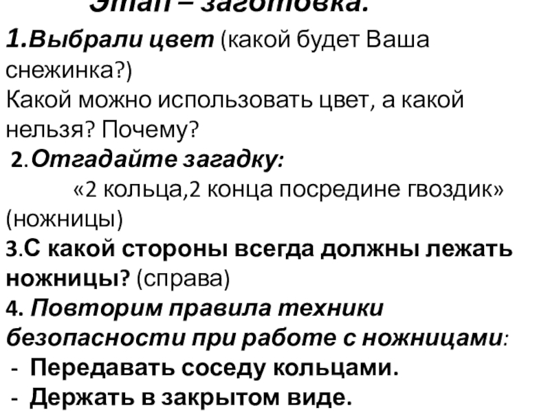 будет Ваша снежинка?) Какой можно использовать цвет, а какой нельзя? Почему? 2.Отгадайте загадку:   «2 кольца,2 конца посредине гвоздик» (ножницы) 3.С какой стороны всегда должны лежать ножницы? (справа)        4. Повторим правила техники безопасности при работе с ножницами:  - Передавать соседу кольцами. - Держать в закрытом виде.