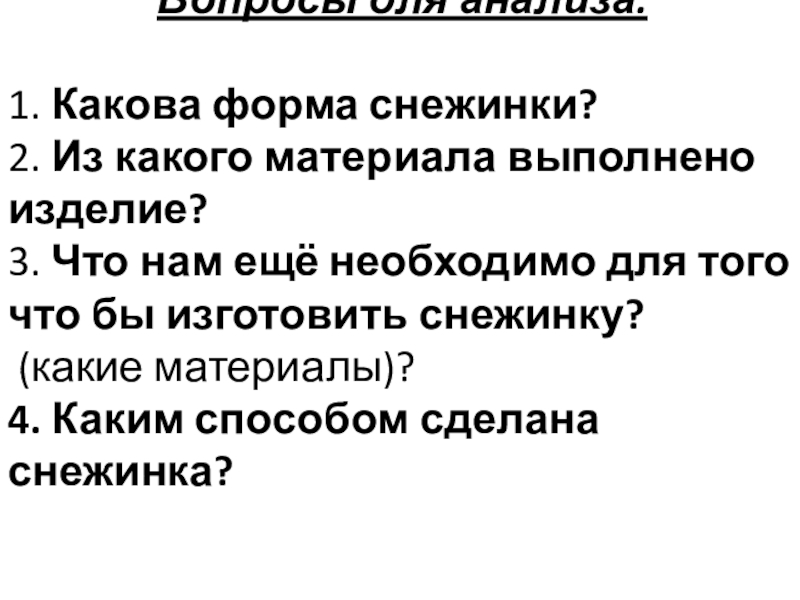 Какова форма снежинки? 2. Из какого материала выполнено изделие? 3. Что нам ещё необходимо для того что бы изготовить снежинку? (какие материалы)?   4. Каким способом сделана снежинка?