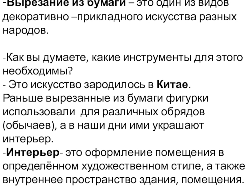 разных народов. -Как вы думаете, какие инструменты для этого необходимы? - Это искусство зародилось в Китае. Раньше вырезанные из бумаги фигурки использовали для различных обрядов(обычаев), а в наши дни ими украшают интерьер. -Интерьер- это оформление помещения в определённом художественном стиле, а также внутреннее пространство здания, помещения.