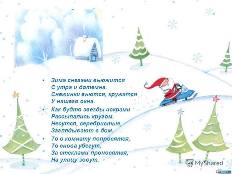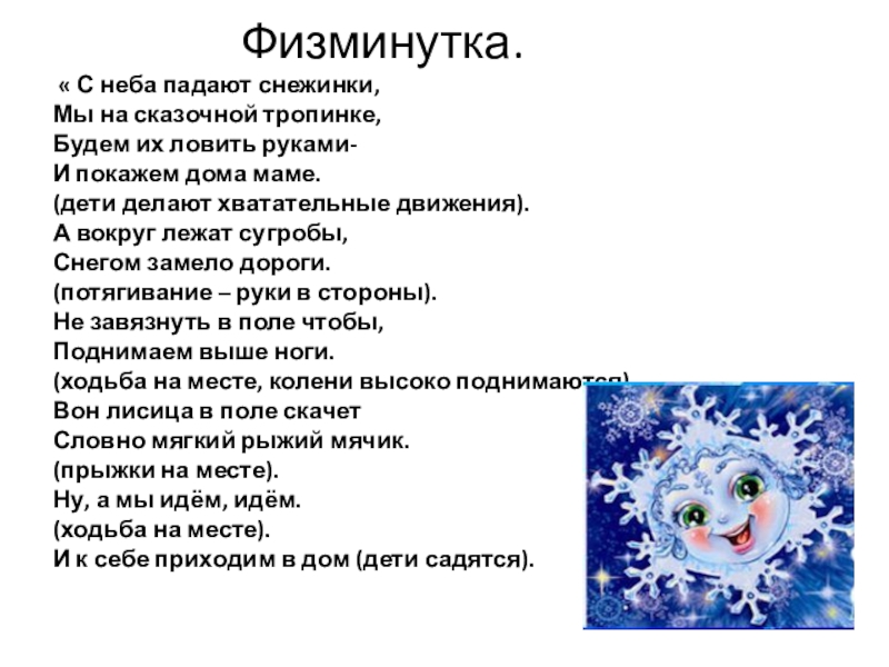 С неба падают снежинки, Мы на сказочной тропинке, Будем их ловить руками- И покажем дома маме. (дети делают хватательные движения). А вокруг лежат сугробы, Снегом замело дороги. (потягивание – руки в стороны). Не завязнуть в поле чтобы, Поднимаем выше ноги. (ходьба на месте, колени высоко поднимаются). Вон лисица в поле скачет Словно мягкий рыжий мячик. (прыжки на месте). Ну, а мы идём, идём. (ходьба на месте). И к себе приходим в дом (дети садятся).