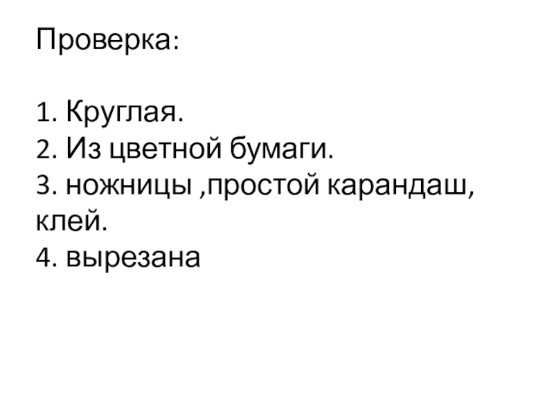 Проверка:  1. Круглая. 2. Из цветной бумаги. 3. ножницы ,простой