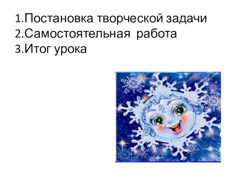 1.Постановка творческой задачи 2.Самостоятельная  работа  3.Итог урока