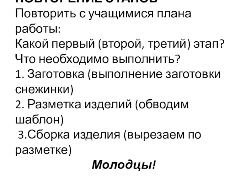 ЭТАПОВ Повторить с учащимися плана работы: Какой первый (второй, третий) этап? Что необходимо выполнить? 1. Заготовка (выполнение заготовки снежинки) 2. Разметка изделий (обводим шаблон)  3.Сборка изделия (вырезаем по разметке) Молодцы!