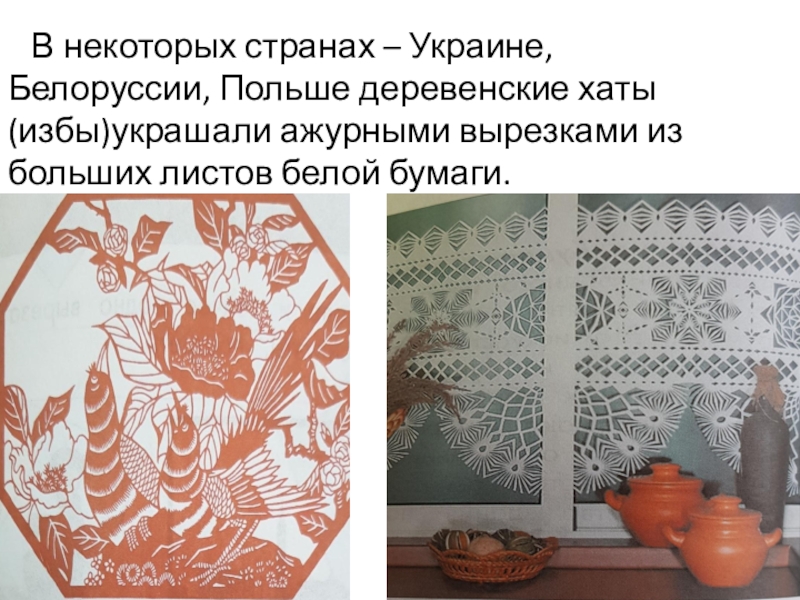 В некоторых странах – Украине, Белоруссии, Польше деревенские хаты(избы)украшали ажурными вырезками из больших листов