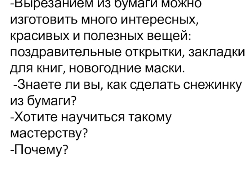 поздравительные открытки, закладки для книг, новогодние маски. -Знаете ли вы, как сделать снежинку из бумаги? -Хотите научиться такому мастерству? -Почему?