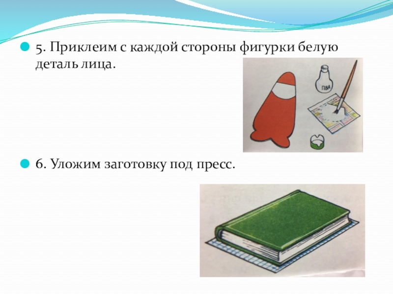 5. Приклеим с каждой стороны фигурки белую деталь лица.6. Уложим заготовку под пресс.