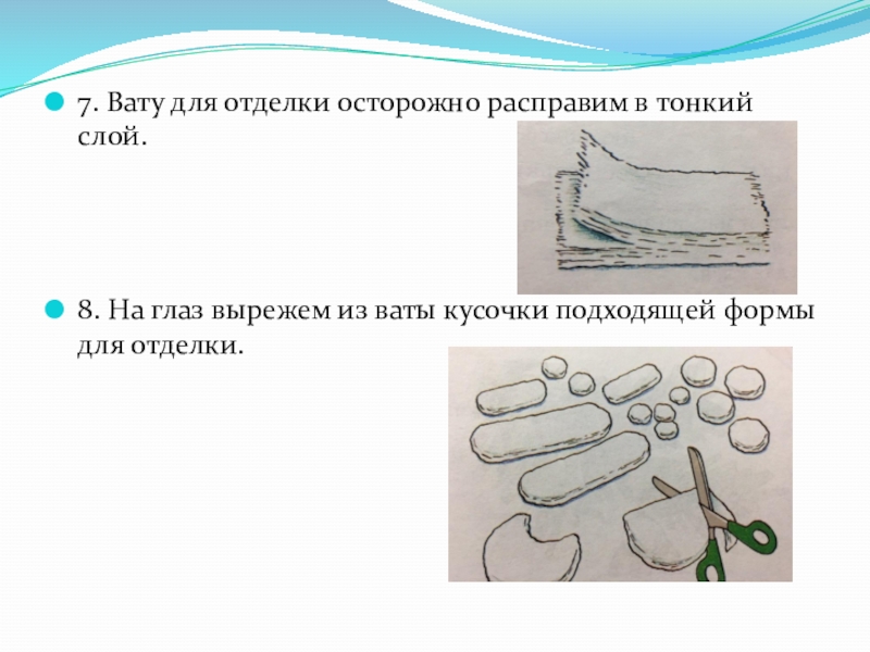 Слайд 128. На глаз вырежем из ваты кусочки подходящей формы для отделки.