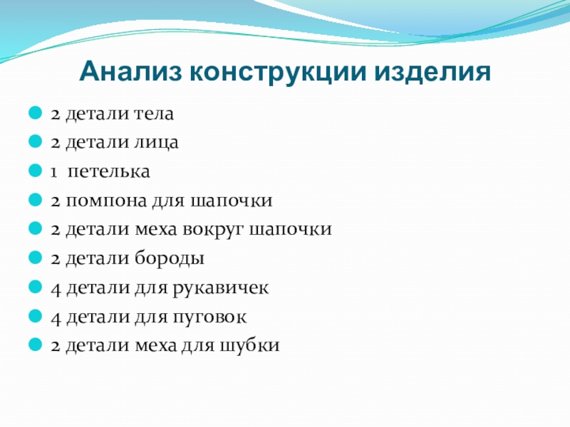 Анализ конструкции изделия2 детали тела2 детали лица 1 петелька2 помпона для шапочки2 детали меха вокруг шапочки2 детали
