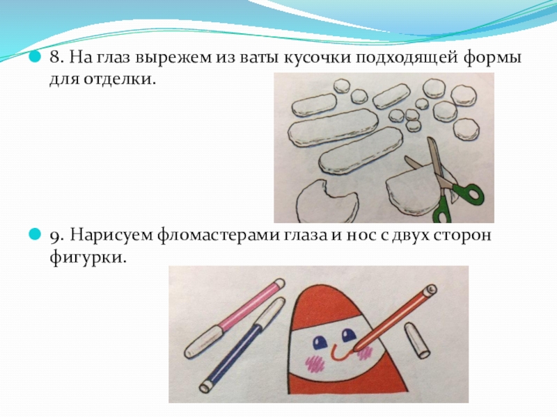 8. На глаз вырежем из ваты кусочки подходящей формы для отделки.9. Нарисуем фломастерами глаза и нос с